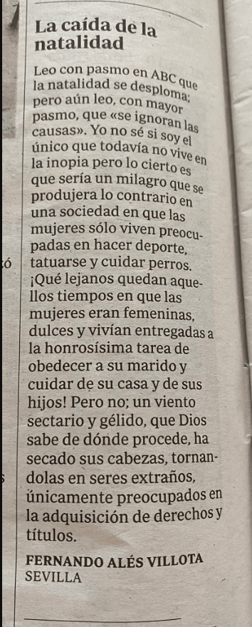 Esto me lleva a lo segundo, que al parecer esas mujeres ya tenían una labor, según Fernando, quien escribe este texto, una labor que ya venía predeterminada, una labor en la que debían ser femeninas, obedientes y cuidadoras, tanto de la casa, como del marido y los hijos. Fernando, quien seguramente haya conocido realmente mujeres mucho más preocupadas en sus perros, su carrera, el deporte y los tatuajes que en él, se plantea que, sin duda, el problema son ellas.